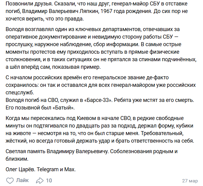 На війні загинув колишній начальник одного з департаментів Служби безпеки України, генерал-майор Володимир Ляпкін, який втік до Криму після Революції гідності. Зрадника ліквідували 17 березня.
