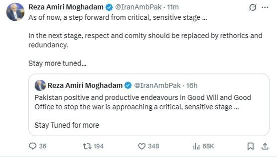Водночас посол Ірану в Пакістані Реза Амірі заявив, що Іран та США зробили крок вперед від критичної стадії.