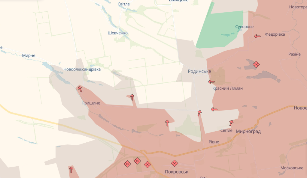 Російські війська просунулися на окремих ділянках фронту: у Покровсько-Мирноградській агломерації в районі Родинського та на Куп'янському напрямку, поблизу Піщаного, Відповідні зміни відображені на оновлених мапах OSINT-проєкту DeepState, які демонструють актуальну ситуацію на фронті.