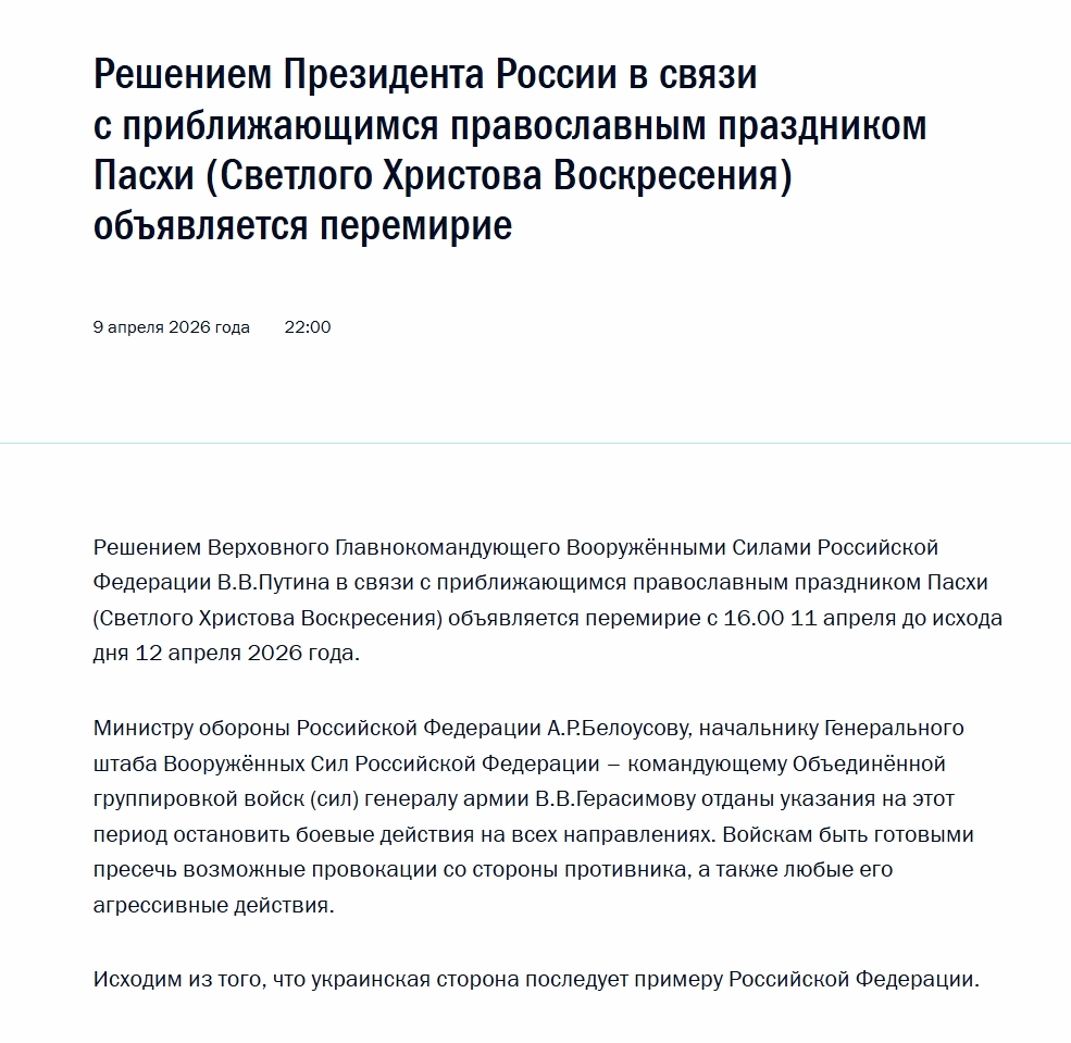 У повідомленні про перемир'я тільки зазначено, що міністру оборони РФ Андрію Бєлоусову і начальнику Генерального штабу ЗС РФ Валерію Герасимову віддано вказівки на період "з 16.00 11 квітня до кінця дня 12 квітня 2026 року зупинити бойові дії на всіх напрямках".