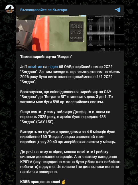 OSINT-фахівці змогли підрахувати, що станом на кінець січня 2026 року було виготовлено щонайменше 440 САУ 2С22 "Богдана". Аналітики припускають, що останні дані свідчать про підтримання раніше заявленого темпу виробництва.