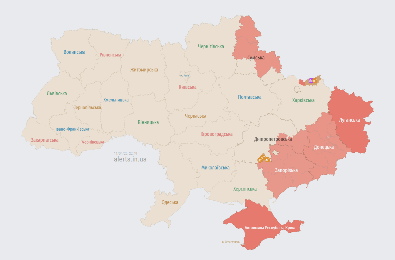 На момент виходу матеріалу повітряна тривога була оголошена у частині Запорозької, Сумської, Харківської та Дніпропетровської областей.