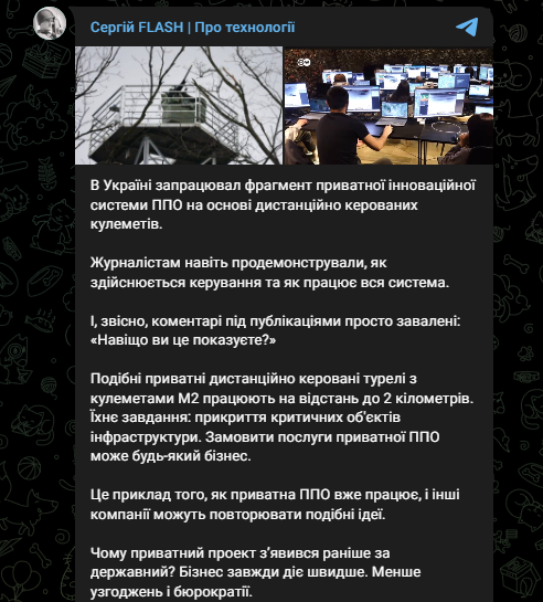 "Флеш" зазначає, що ці приватні ППО дозволяє закривати об'єкти критичної інфраструктури. Про це він написав у своєму Telegram.