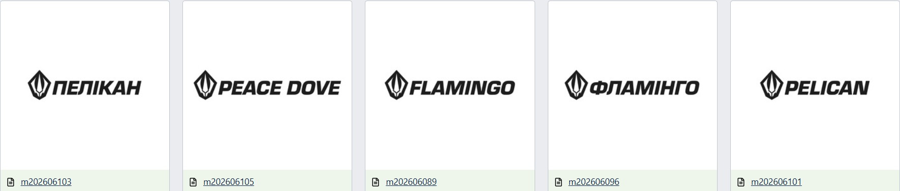 Заявки на реєстрацію торгівельних марок перебувають на стадії розгляду — це документи № m202606089 (на Flamingo), № m202606096 ("Фламінго"), № m202606101 (Pelikan), № m202606103 ("Пелікан"), № m202606105 (Peace Dove). Вказано, що назви резервуються для товарів та послуг класів 9 (вимірювальні апарати та датчики), 12 (апарати для переміщення у трьох стихіях), 13 (боєприпаси), 37 (встановлення та ремонт), 42 (програмне забезпечення). Зовнішнього вигляду об'єктів не має, а є лише фірмовий надпис поруч з логотипом компанії Fire Point.