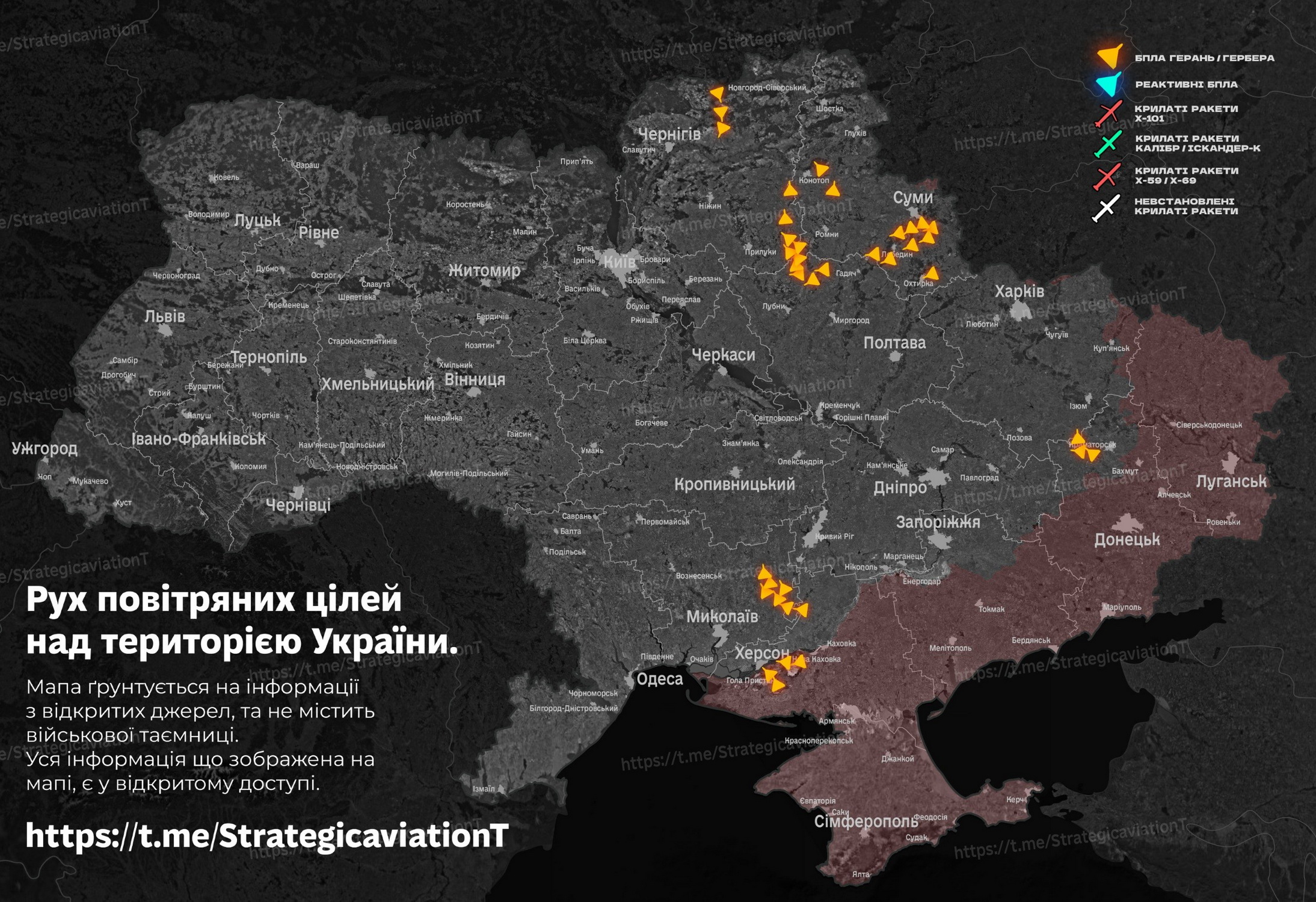 Ще одна група повідомлень стосується пусків дронів-камікадзе ЗС РФ. Згідно з даними моніторингу, станом на 13 год РФ запустила 37 груп "Шахедів" та БпЛА інших типів з шести полігонів по периметру України — "Цимбулова", "Халіно", "Приморсько-Ахтарськ", "Міллерово", "Гвардійське" (в Криму). Загальна кількість безпілотників у небі над Україною — орієнтовно від 30 до 70, ідеться у дописі. Тим часом у каналі "Стратегічна авіація" опублікували інфографіку з поточними даними про місцерозташування російських безпілотників: вони зосередились у Херсонській та Миколаївській областях, на адміністративній межі Донецької та Харківської й також над Чернігівською, Сумською, Полтавською областями.