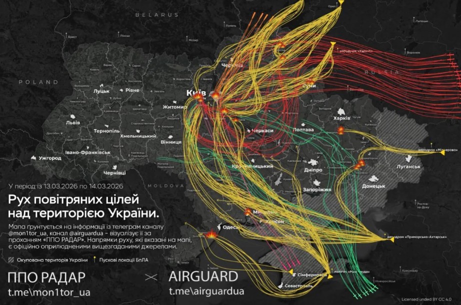 Обстріл України — траєкторія ракет та дронів 14 березня