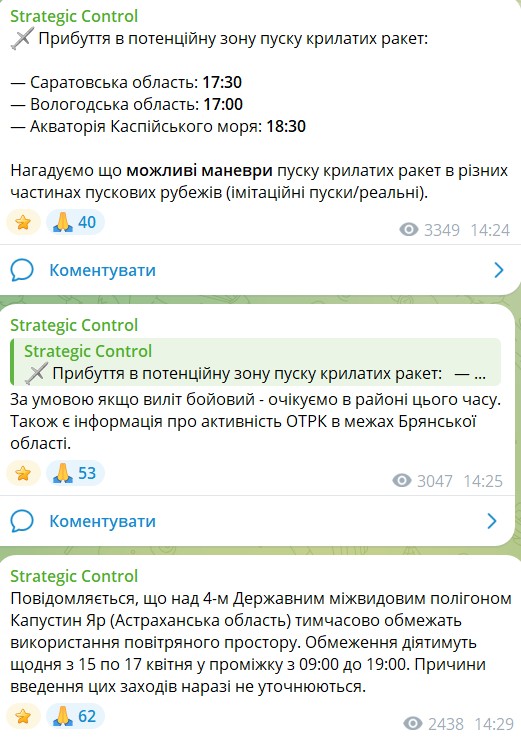Перша інформація про зліт російських бомбардувальників з'явився у Telegram-каналі Strategiс Сontrol близько 14 год 15 квітня. Вказувалось, що у Мурманській області підняли у повітря від чотирьох до шести Ту-95МС і що ідеться, найімовірніше, про бойовий виліт, а не імітацію. Можливі пуски відбудуться у момент, коли бомбардувальники досягнуть Саратовської, Вологодської області та акваторії Каспійського моря. Час пуску — з 17 до 18:30, ідеться у повідомленні. Фокус зібрав інформацію з відкритих джерел про ймовірність нового повітряного удару ЗР 15 квітня та порівняв дані з попередніми російськими обстрілами, які відбувались за схожим сценарієм.