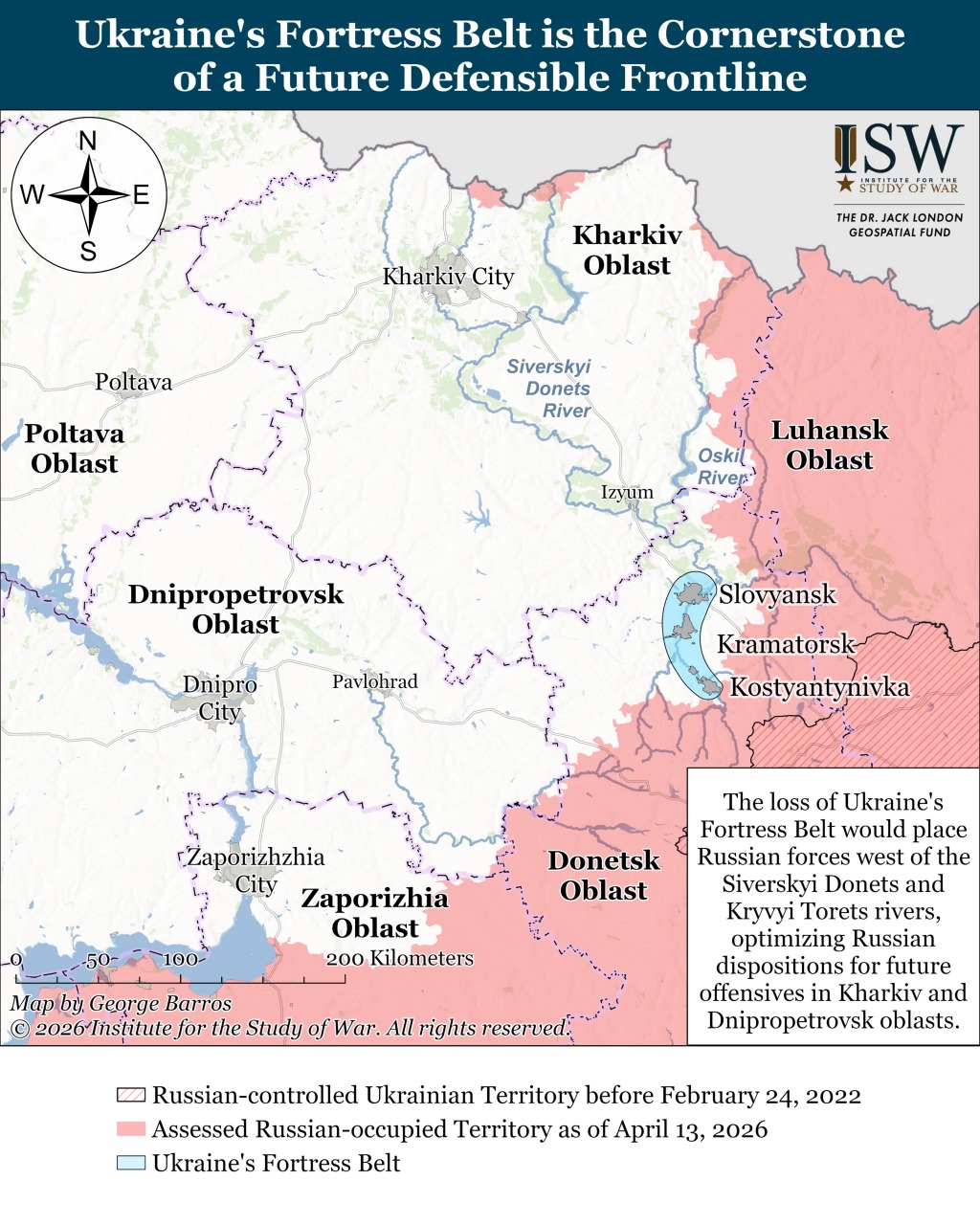 Аналітики підкреслили, що втрата контролю над поясом міст-фортець вимагала б від України облаштування нових укріплень на півдні Харківської та на сході Дніпропетровської областей, проте специфіка цієї місцевості погано підходить для оборонних дій.