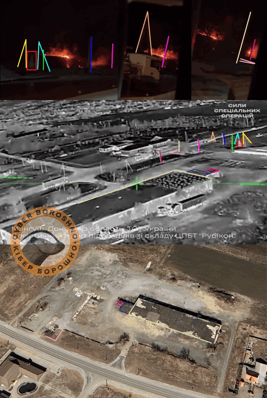 Для удару по базі "Рубікон" ЗС РФ українські спецпризначенці використали дев'ять ударних дронів, ідеться у Telegram-каналі OSINTерів "КіберБорошно". Після серії уражень загорівся найбільший склад: вогонь охопив 70% від площі даху 2300 кв. км. Інші цілі — склад з прибудовою 350 кв. м та ще одне складське приміщення на 350 кв. м. Кадри з місця подій під Мангушем також показали російські вантажівки навколо логістичного об'єкта. З цього зробили висновок, що на базі могли зберігатись важливі речі ЗС РФ (зброя, БК, військова техніка), пояснили аналітики.