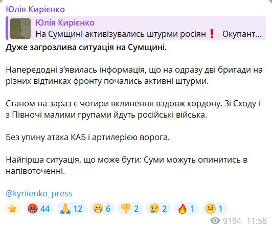 Російські війська намагаються наступати на Суми з двох напрямків — з півночі та сходу, ідеться у дописі Кирієнко у Telegram-каналі. Противник тисне на позиції двох українських бригад, які тримають тут оборону, тим часом на кордоні є чотири прориви. Зі слів воєнкорки, росіяни завдають масованих повітряних ударів та діють малими групами.