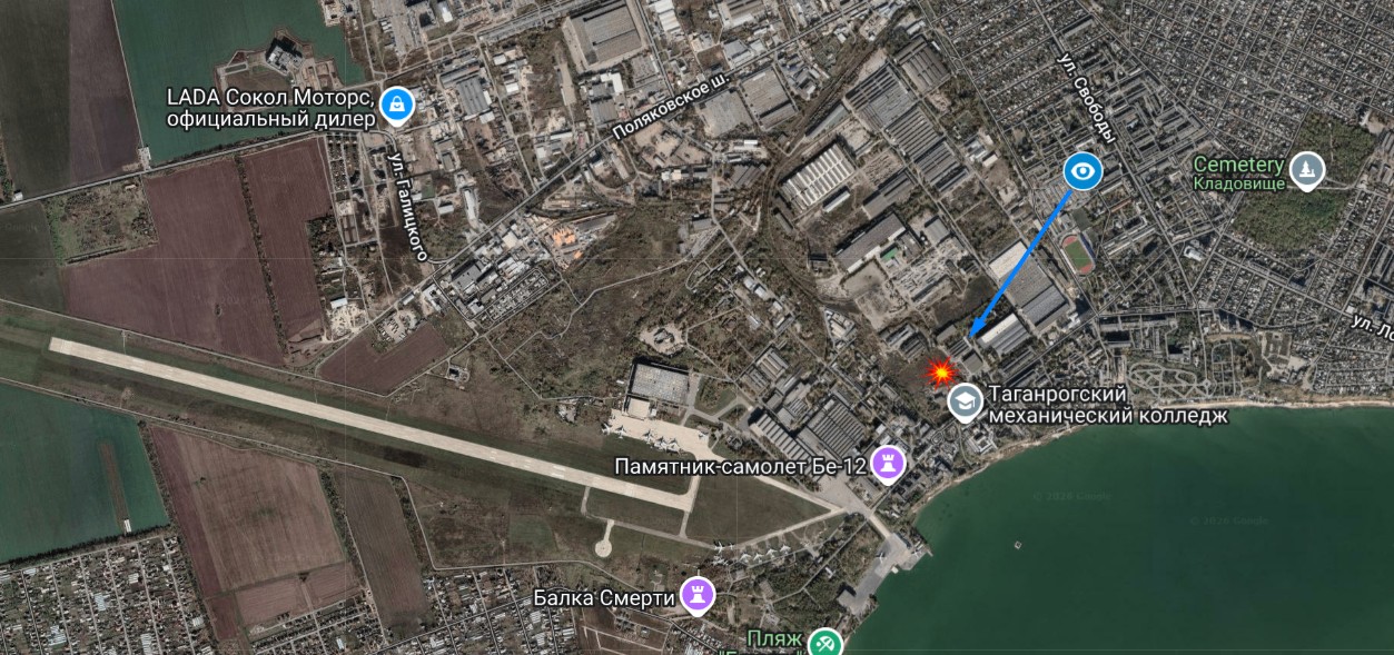 Свіже супутникове фото виробництва ТОВ "Атлант Аеро" показало вісім цехів різного розміру, які з'явились на західній околиці Таганрога, свідчать зображення, опубліковані журналістом медіа "Радіо Свобода" Марком Крутовим. Після удару "Нептуна" замість однієї з будівель залишились руїни, які зафіксував супутник. Уражена точка розташована на 900 м на північний схід від спостерігача, який знімав спалахи вогню під час удару 19 квітня, показала геолокація OSINTера з ніком ne_kotletka.