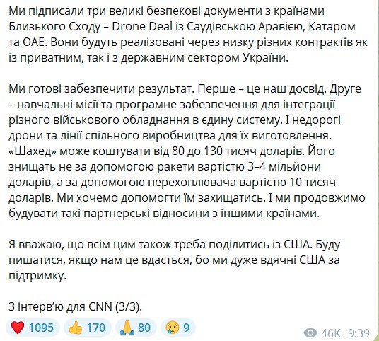Інтерв'ю Зеленського CNN з'явилось увечері 22 квітня. У 15-хвилинній розмові торкнулись питань війни в Ірані й того, як Україна може допомогти країнам Близького Сходу впоратись з атаками дронів-камікадзе "Шахед". Президент повідомив, що Drone Deal уклали з трьома країнами — з Об'єднаними Арабськими Еміратами, Саудівською Аравією та Катаром. Зі слів глави держави, ідеться про три напрямки співпраці. Перший напрямок — це український досвід, другий — навчання військових та софт для "інтеграції різного військового обладнання в єдину систему". Наступні напрямки — це "недорогі дрони та лінії спільного виробництва для їх виготовлення".
