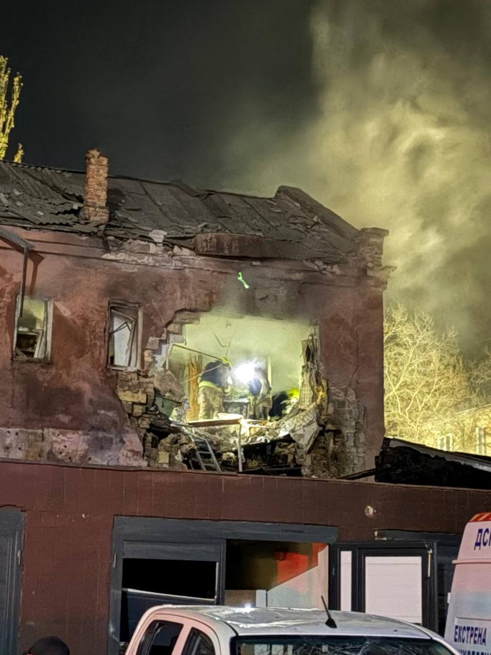 В ДСНС уточнили, що зруйновано два 2-поверхові житлові будинки, з яких пожежники врятували одну людину та евакуювали ще 20 осіб, серед яких двоє — діти. Постраждало 7 осіб.