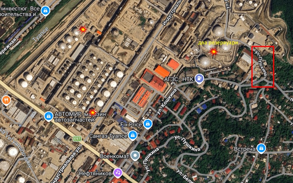 OSINTери озвучили точні координати чотирьох точок у Туапсе, у яких горять резервуари НПЗ. Геолокація показала два палаючі резервуари з координатами 44.103117,39.102745, третій — у точці 44.100777,39.096268, четвертий — 44.103963,39.095760. Також зауважується, що ймовірне "перекидання пожежі на сусідні ємності".