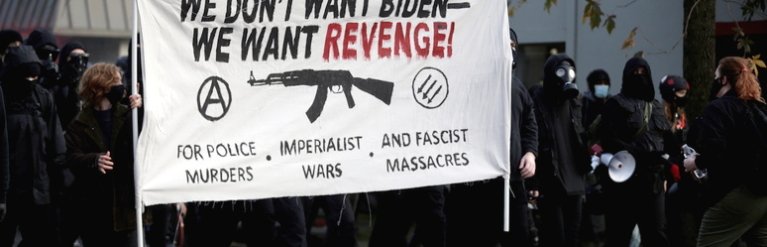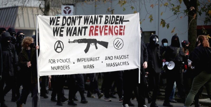 "Нам не потрібен Байден. Ми хочемо помститися за імперіалістичні війни, а також за поліцейські вбивства і фашистські погроми", — йдеться на плакаті, під яким анархісти пройшли в центр міста, попередньо екіпірувавшись для можливого протистояння.