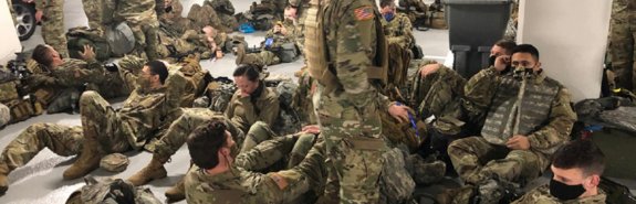 Після того, як бійців попросили покинути будівлю Капітолію, частину з них розмістили у паркінгу. У ньому не було відповідних умов, на 5000 бійців була одна ванна. Частина бійців була змушена розташовуватися прямо на підлозі. Дотримання соціальної дистанції в таких умовах є складним.