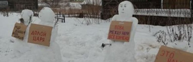 На фото — кілька сніговиків із плакатами. На них написано "Геть царя", "Вова, між нами все скінчено", "Мир хатам війна палацам", "Це наша країна". Фігури зі снігу активістка зліпила під вікнами свого будинку, а фото розмістила на сторінці у "ВКонтакте".