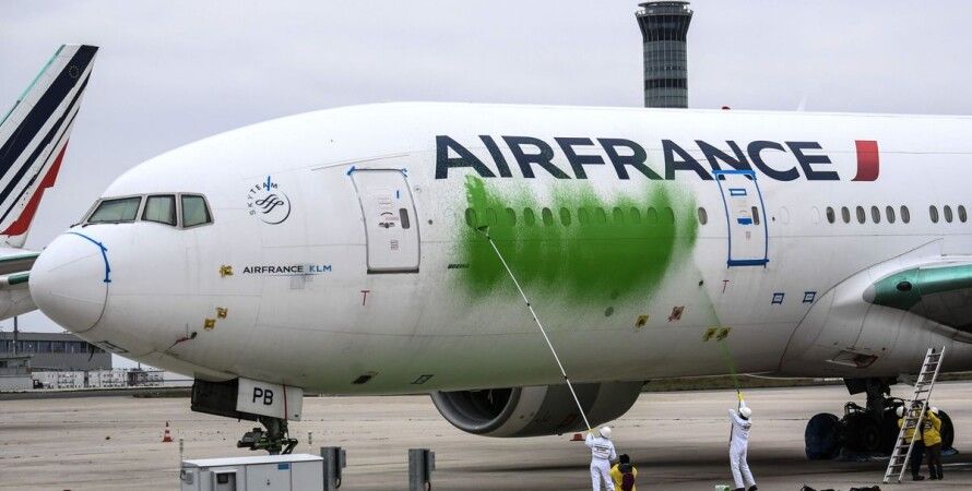 Активісти руху Greenpeace проникли на територію аеропорту "Шарль-де-Голль" (Париж, Франція) і розфарбували авіалайнер Boeing 777 компанії Air France зеленою фарбою.
