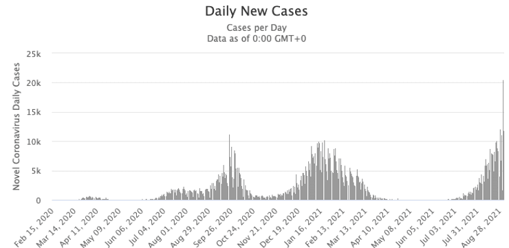 Незважаючи на масову вакцинацію в Ізраїлі й той факт, що ця країна першою заявила про те, що вакциновано майже все населення, зараз там спостерігається новий виток пандемії. Як показує статистика на сайті Worldometers, 1 вересня число нових випадків склало більше 20 тисяч, в той час як 1 серпня трималося на рівні 1 783.