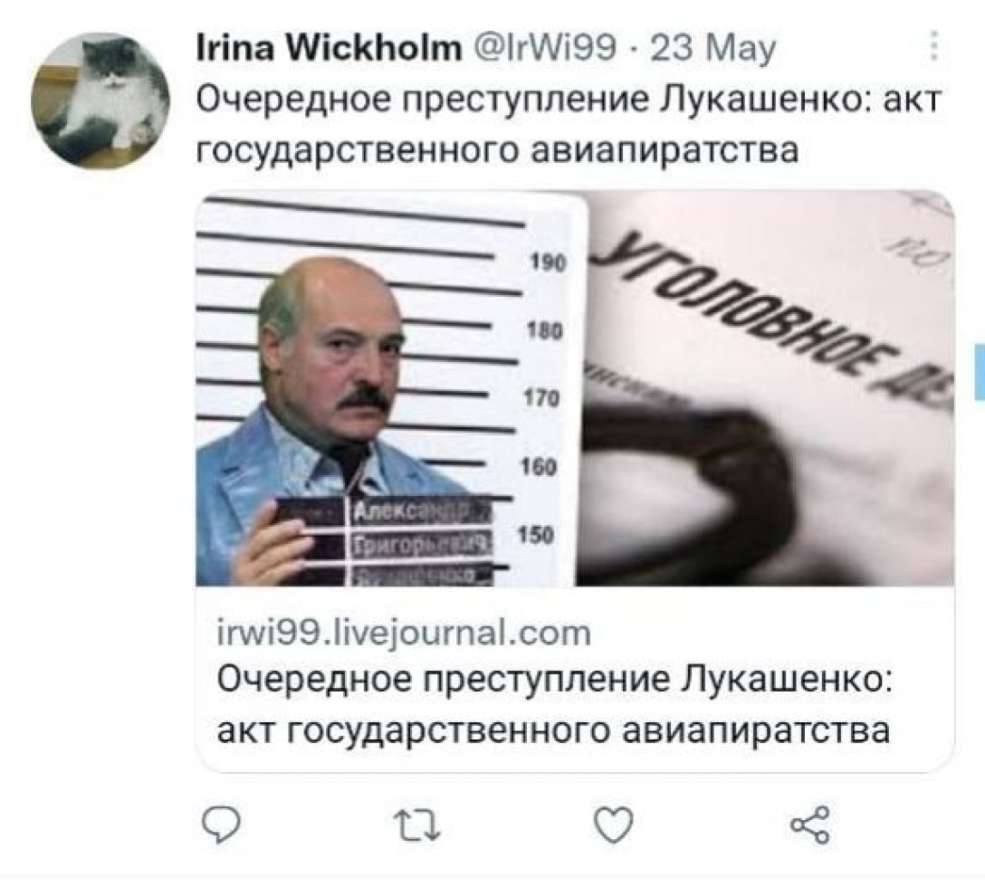 Суд Московського району Бреста засудив росіянку Ірину Вікхольм до 1,5 років колонії загального режиму. Причиною послужило розміщення в соцмережах матеріалу BBC про посадку літака Ryanair в Мінську з підписом: "Новий злочин Лукашенкащодо: акт державного авіапіратства". Про це повідомляє білоруська правозахисна організація "Вясна".