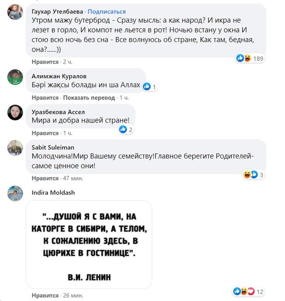 У нечисленних коментарях користувачі соцмережі висловлювали підтримку сім'ї казахстанського правителя, однак були іронічні висловлювання, що натякають на виїзд Назарбаєва з країни у перший день протестів.