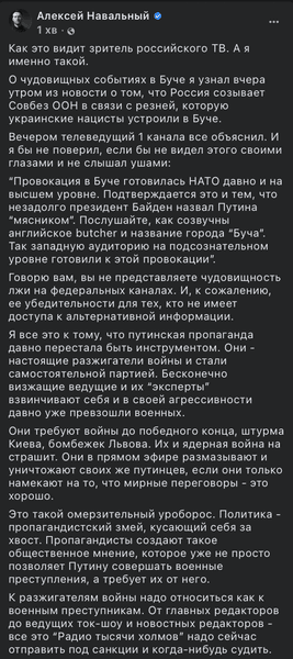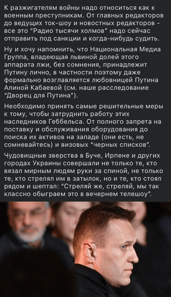 Також Навальний наголосив, що відповідальність за воєнні злочини, скоєні в Бучі, Ірпені та інших містах України, мають нести не лише російські військові, а й ті, "хто поруч і шепотів: "Стріляй же, стріляй, ми так класно обіграємо це у вечірньому телешоу".