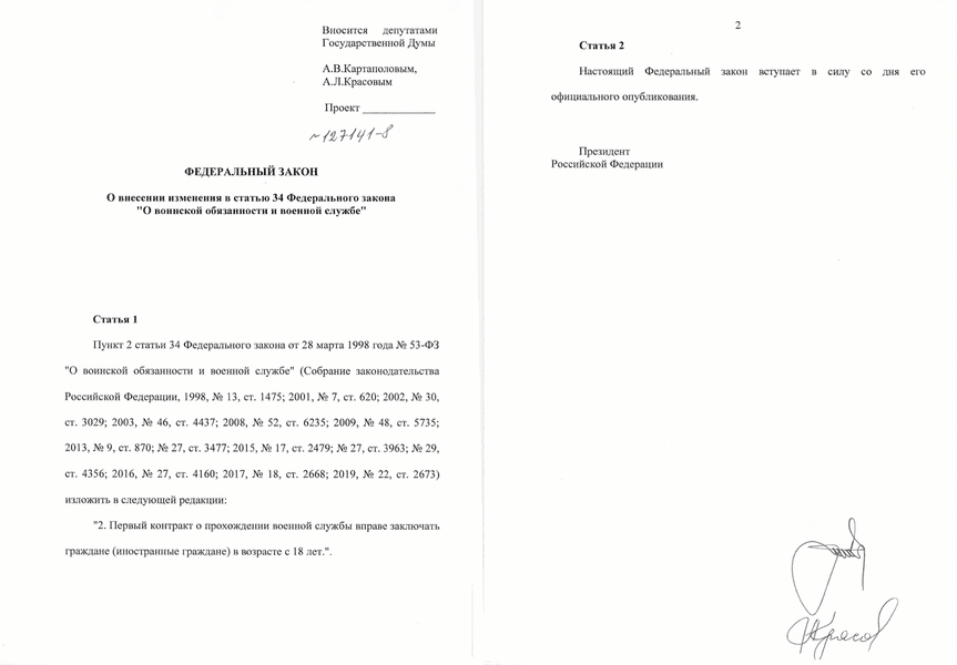 Відповідно до чинної на цей час редакції російського закону "Про військовий обов'язок та військову службу", перший контракт на військову службу можуть укласти громадяни РФ у віці від 18 до 40 років та іноземці, яким від 18 до 30 років.