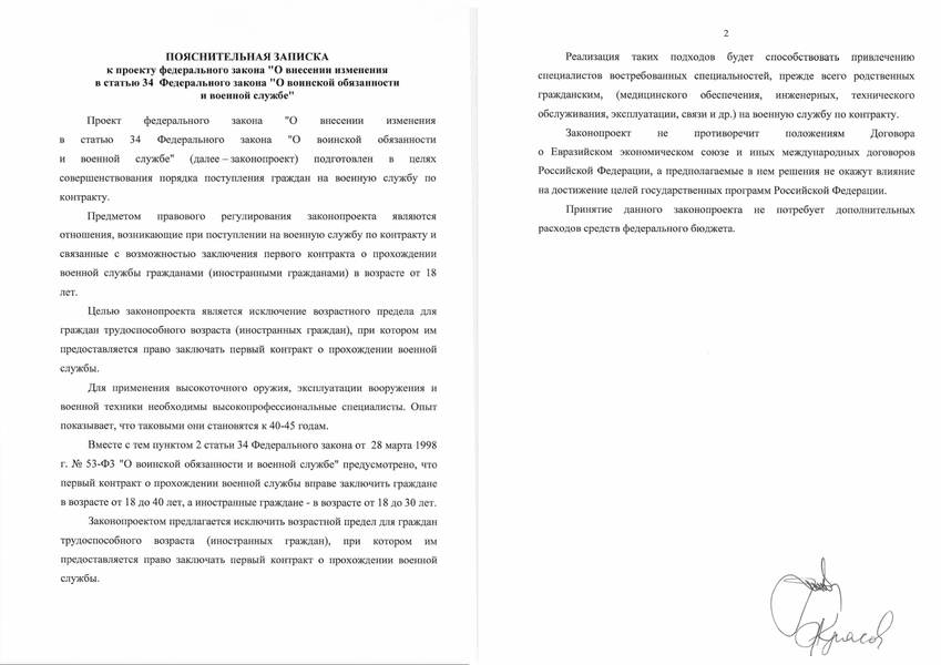 У записці також зазначено, що цей законопроєкт дозволить залучити на контрактну службу фахівців потрібних спеціальностей — інженерних, а також у сферах медичного забезпечення, технічного обслуговування, експлуатації, зв'язку та інших.