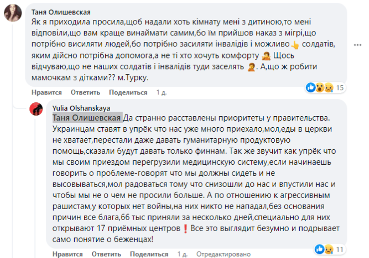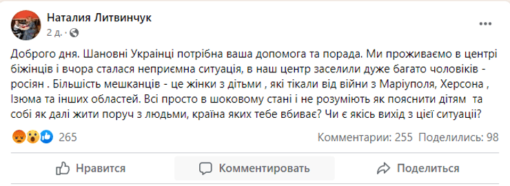 "Відбулася неприємна ситуація, до нашого центру заселили дуже багато чоловіків — росіян. Більшість жителів (центру) — це жінки з дітьми, які тікали від війни з Маріуполя, Херсона, Ізюма та інших областей. Усі у шоковому стані і не розуміють, як пояснити дітям і як далі жити поруч із людьми, країна яких тебе вбиває", — зазначила українка Наталія Литвинчук.