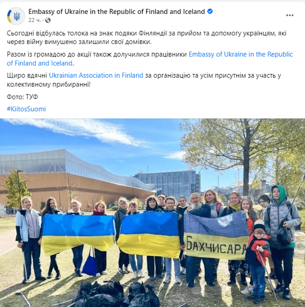 Останній пост посольства України у Фінляндії з Facebook присвячений толоці на знак подяки Фінляндії за прийом та допомогу українцям, які через війну вимушено залишили вдома.