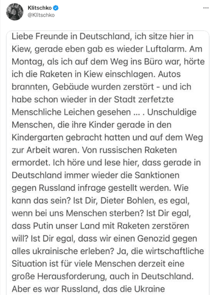"Якщо Дітер Болен приїде в Україну та на власні очі побачить, як люди живуть під час війни, це допоможе йому краще зрозуміти світ. У понеділок (10 жовтня) я побачив тіла в центрі Києва після вибуху ракет. Після такого погляди Болена, безумовно, змінилися б", — продовжив Кличко.