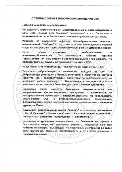 Згідно з новими вимогами, пропагандистам слід шанобливо ставитись до мобілізованих громадян РФ — під заборону потрапив такий неологізм, як "мобіки". Водночас громадян, які тікають від мобілізації з Росії, радять висміювати та таврувати такими словами, як "релоканти", "убєжанти" та "пєрєждуни".