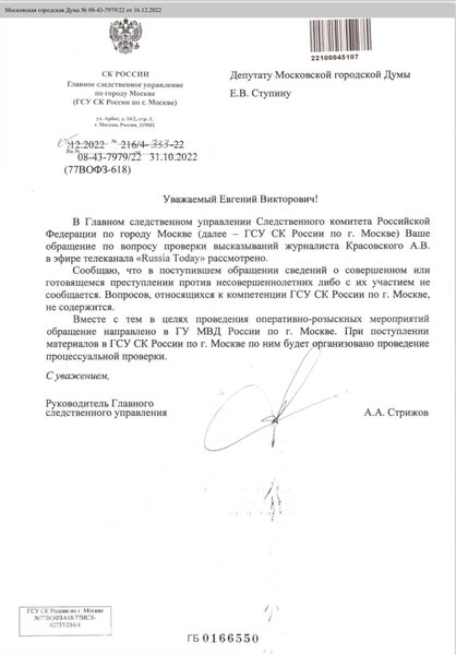 "Матеріал спочатку спустили в управління по Москві, потім перенаправили в МВС, нібито підслідності СК РФ не вбачається. Тобто, не розпалював він розбрату і ворожнечі своїми закликами. Мабуть, збуваються найгірші припущення, що держпропагандиста вирішили "відмазати", — зауважив адвокат.