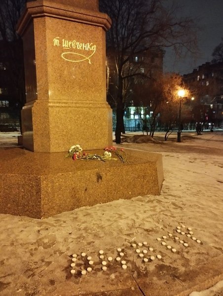 Як повідомляють у російському телеграм-каналі "Бумага" у Санкт-Петербурзі мешканці організували меморіал біля пам'ятника Тарасу Шевченку. Крім того, жителі Петербурга виклали зі свічок слово "Днепр".