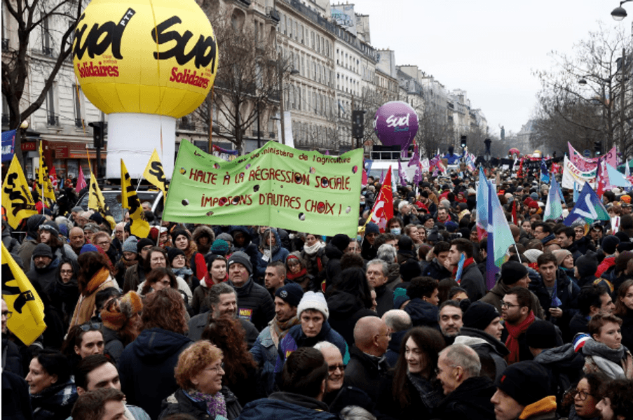 За даними МВС Франції, на вулиці країни вийшли 1,12 мільйона людей, у тому числі 80 000 у Парижі. Профспілки закликали французів протестувати проти пенсійної реформи уряду, яка встановлює пенсійний вік на рівні 64 років.
