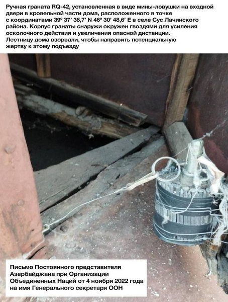 У вищезгаданому листі Джейхуна Байрамова на ім'я Генсека ООН йдеться про продовження Вірменії формування нових бойових позицій на території Азербайджану, де тимчасово розміщено контингент Російської Федерації, а також проведення інженерно-фортифікаційних робіт і в цьому контексті встановлення великої кількості мін. Присутність цього контингенту суттєво обмежила роботи з розмінування.