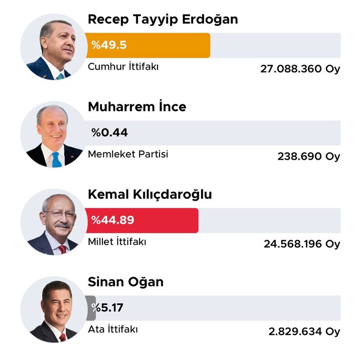 Згідно з попередніми результатами, чинний глава держави Реджеп Тайїп Ердоган отримав 49,51% голосів, а його основний суперник Кемаль Киличдароглу — 44,88%, Сінан Оган набрав 5,17%, а Мухаррем Інсе — 0,44%.