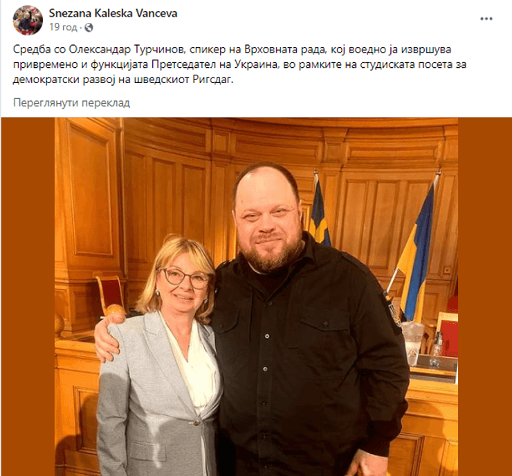 Депутатка із Північної Македонії Снежана Калеска-Ванчева переплутала голову Верховної Ради Руслана Стефанчука із колишнім спікером Олександром Турчиновим під час своєї зустрічі з ним у Швеції. Цю інформацію 26 травня опублікувала Європейська правда, надавши скриншот посту Калески-Ванчової у Facebook, який політик уже виправила на момент публікації матеріалу.