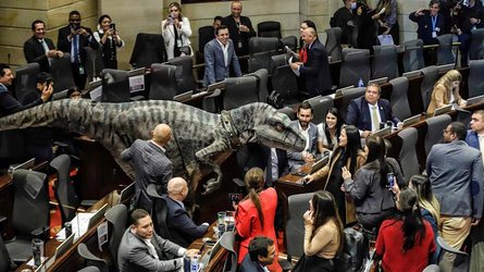 У парламенті Колумбії динозавр розповів парламентарям про кліматичну кризу у світі. Про це написала 14 червня іспанська газета Vanguardia.