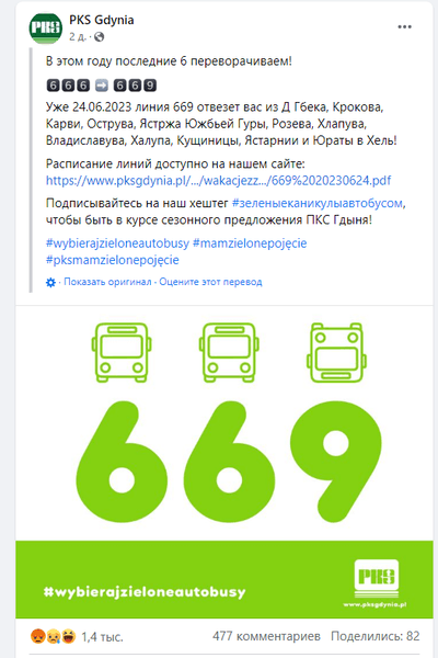 "Цього року останні 6 перевертаємо! Уже 24.06.2023 лінія 669 відвезе вас із Гбека, Крокова, Карві, Острува, Ястржа Южб'єй Гури, Розєва, Хлапува, Владислававува, Халупа, Кущиниці, Ястарнії та Юрати до Геля!", — ідеться в повідомленні PKS Gdynia.