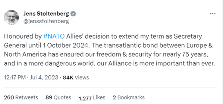 "Для мене велика честь рішення союзників по НАТО продовжити термін моїх повноважень як Генерального секретаря до 1 жовтня 2024 року. Трансатлантичний зв'язок між Європою і Північною Америкою забезпечував нашу свободу і безпеку протягом майже 75 років, і в більш небезпечному світі наш Альянс важливий як ніколи", — написав Столтенберг.