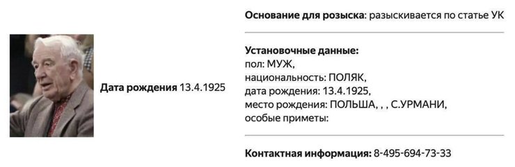 У бланку не вказано статті кримінального кодексу, за якою російська поліція його шукає. У картці вказано тільки національність – поляк. Ймовірно, російські силовики врахували його місце народження та початкове громадянство (село Урмань, зараз це Тернопільська область України).