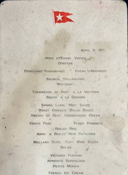 У меню залишився прапор White Star Line, а також мав бути оригінальний позолочений напис із зображенням ініціалів OSNC (Ocean Steamship Navigation Company) поряд із написом RMS Titanic. Жодного іншого зразка першокласного меню на вечерю 11 квітня не знайдено.