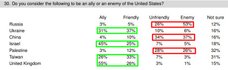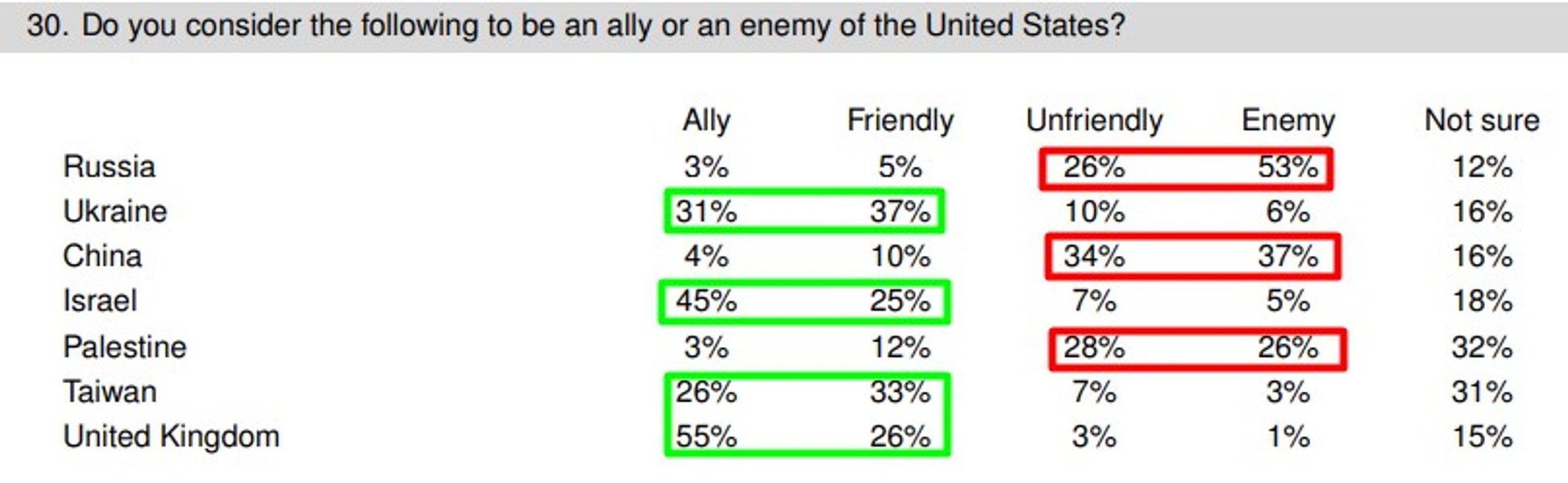 В опитуванні також цікавились, як американці ставляться до війни РФ проти України: більшість вважає Росію агресором. Було ще одне питання — які країни є ворожими або дружніми до США. Друзями виявились Україна, Ізраїль, Тайвань та Велика Британія. Ворожими: Росія, Китай, Палестина.