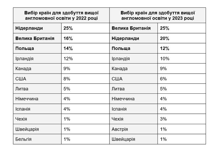 Лідерами стали Велика Британія, Нідерланди та Польща. Статистика показала, що Нідерланди посіли перше місце у 2022 році — країну обрали 25% серед українських абітурієнтів. У 2023 вибір змінився на Велику Британію: туди поїхали навчатися на 9% більше студентів, ніж у 2022 році. У Польщі ситуація не змінювалась: вона посіла третє місце що у 2022 — 14%, то у 2023 році — 12%.