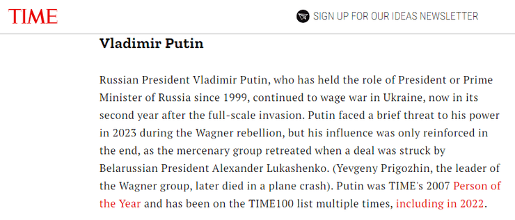 Крім того, видання нагадало, що Путіна визнали людиною року за версією журналу TIME 2007 року, і він неодноразово входив до списку TIME100, зокрема 2022 року.