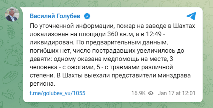 У Ростовській області зросла кількість людей, які постраждали внаслідок пожежі на Шахтинському поліефірному заводі. Про це повідомив губернатор Ростовської області Василь Голубєв.