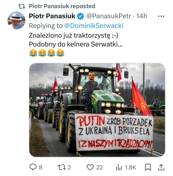 У свому профілі в X Панасюк публікує російські фейки та підтримує армію країни-агресора. Наприклад, нещодавно поляк опублікував допис, де повідомляється про нібито захоплення ЗС РФ Кринок на Лівобережжі Херсонщини. Нагадаємо, 21 лютого аналітики Інституту вивчення війни заявили, що не спостерігають жодних візуальних доказів помітного просування Росії поблизу обмеженого українського плацдарму в Кринках.