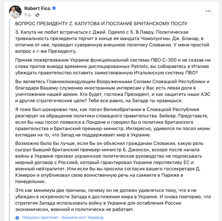 "Я не переконаний у щирості Заходу в досягненні миру в Україні. І знову повторю, що стратегія Заходу використати війну в Україні для ослаблення Росії економічно, військово і політично не працює", — наводить видання слова Фіцо, які він написав минулими вихідними в Facebook.