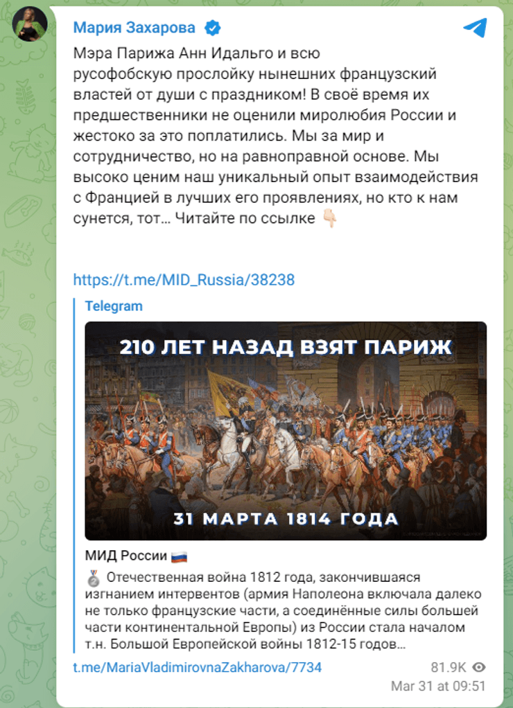 Крім цього, Захарова пригадала, що 210 років тому — 31 березня 1814 — Париж було захоплено російською армією.